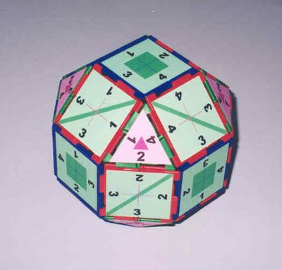 Cuboctaedro rômbicoUma solução de um puzzle do cuboctaedro rômbico em que as placas são as do cubo (1) mais as do octaedro (1), mais as do cubo (2) duplicadas e que são [1122], [1133], [1144], [2233], [2244] e [3344].