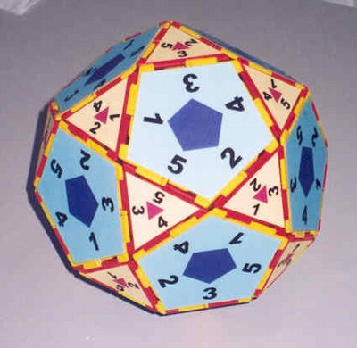 Solução de um puzzle do icosidodecaedro em que as placas são as do icosaedro (1) mais as do dodecaedro (2).